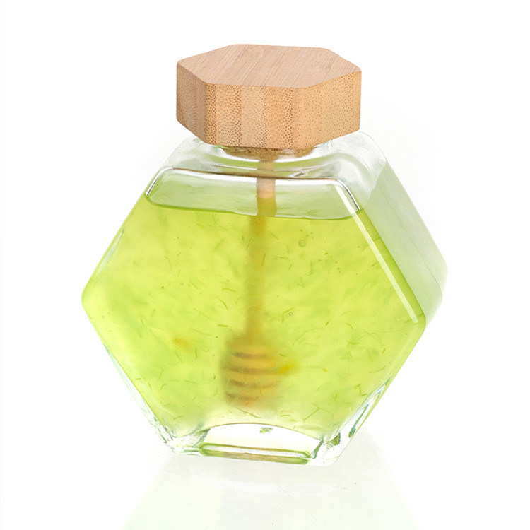 Nossos potes de mel se distinguem por sua forma única de favo de mel hexagonal e material de bambu ecologicamente correto. Cada pote de mel é feito de vidro de alta qualidade e tem uma forma hexagonal com favo de mel em ambos os lados, ideal para armazenar mel. Além disso, também equipamos cada pote de mel com uma tampa de bambu e um palito de bambu para torná-lo mais conveniente para você usar.